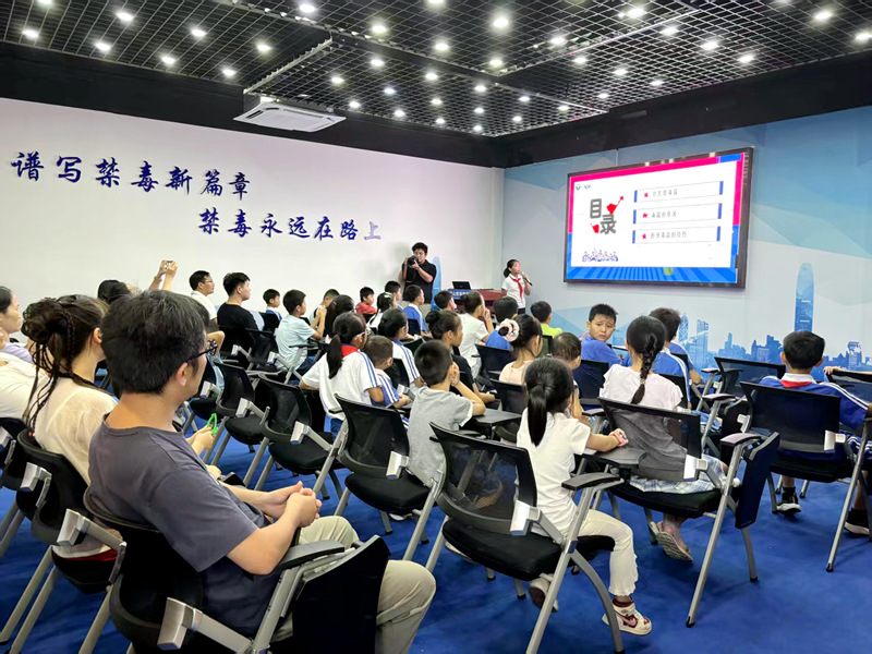 活动中,亲子志愿讲解员带领大家参观展厅,从“中国百年禁毒史”到“认识毒品”,从“吸毒危害理论知识”到“吸毒危害真实案例”……通过七个主题板块的详细讲解,结合VR/AR体验互动,让家长与孩子们学习了多维度的禁毒知识。在多功能室,“梦想家”禁毒志愿讲师通过PPT和视频案例等,深入剖析新型毒品的伪装性、成瘾性及社会危害性,重点传授“拒毒五式”防毒技巧,并特别提醒青少年:暑期社交活动增多,务必警惕“零食化”“娱乐化”毒品的陷阱,遇到可疑情况要第一时间报警或联系家长和老师。