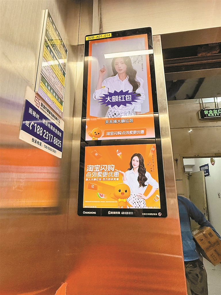 ▲东门168里的电梯广告。 深圳晚报记者 郑淑仪 摄
