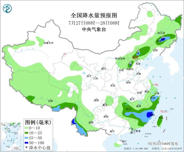 25日至27日,陕西北部、内蒙古中东部、京津冀、东北地区等地有持续性强降雨,上述地区有大到暴雨,部分地区有大暴雨,单点有特大暴雨;并伴有短时强降水、雷雨大风或冰雹等强对流天气。此外,华东地区有分散性阵雨或雷阵雨,其中沿海地区有大到暴雨。