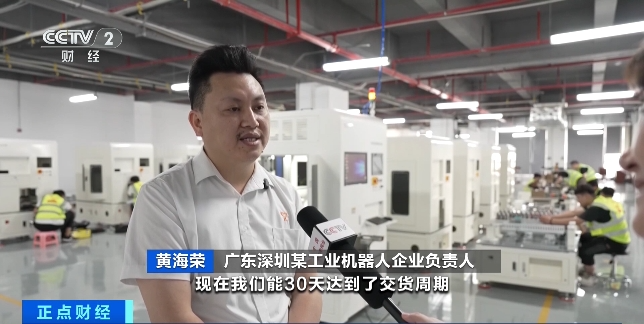 广东深圳某工业机器人企业负责人 黄海荣:我们的订单已经排到今年11月份。以往交付这条生产线需要60天,现在30天就能达到交货周期,主要原因有整个工业机器人核心部件、算力和软件都是国产化。