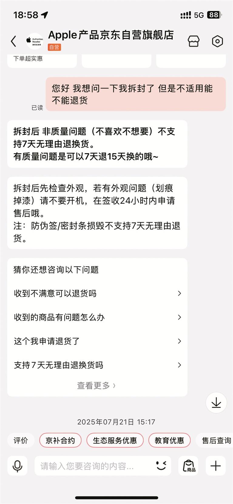 随后,深晚记者以消费者的身份,就“开封后能不能退货”的问题,在线上与京东、淘宝等平台的售后客服联系。客服回复:“商品拆封后,如果是非质量问题(如不喜欢、不想要),那么是不支持7天无理由退货的。”
