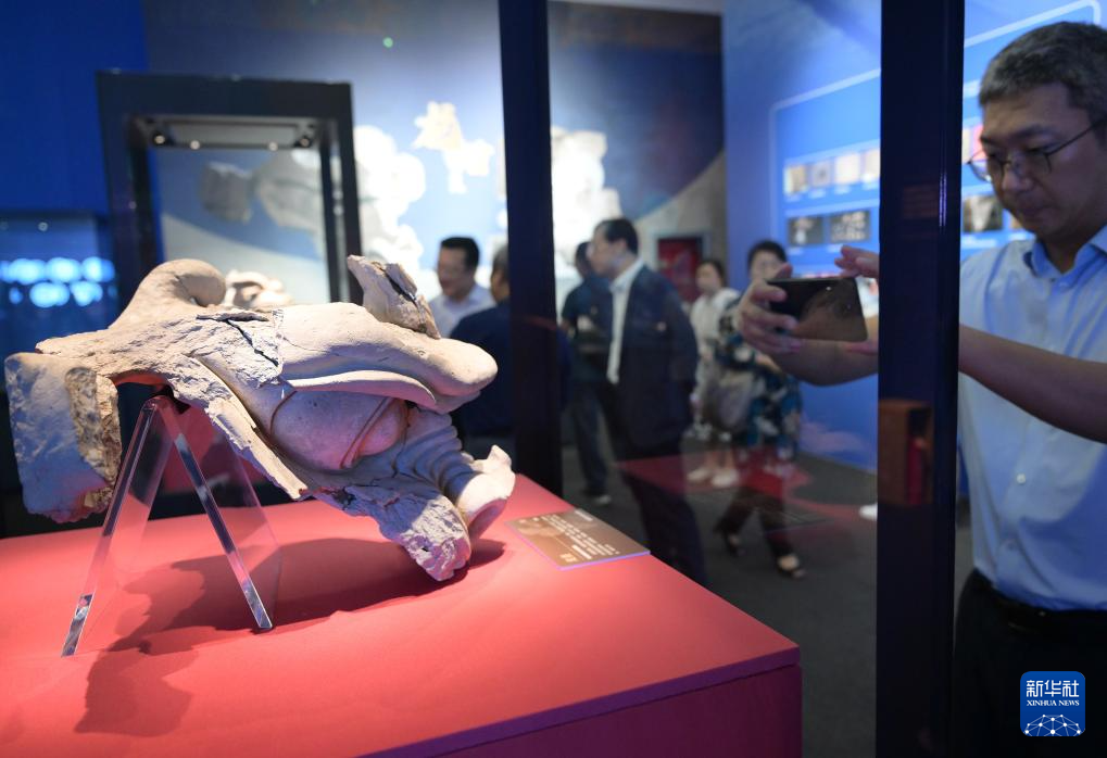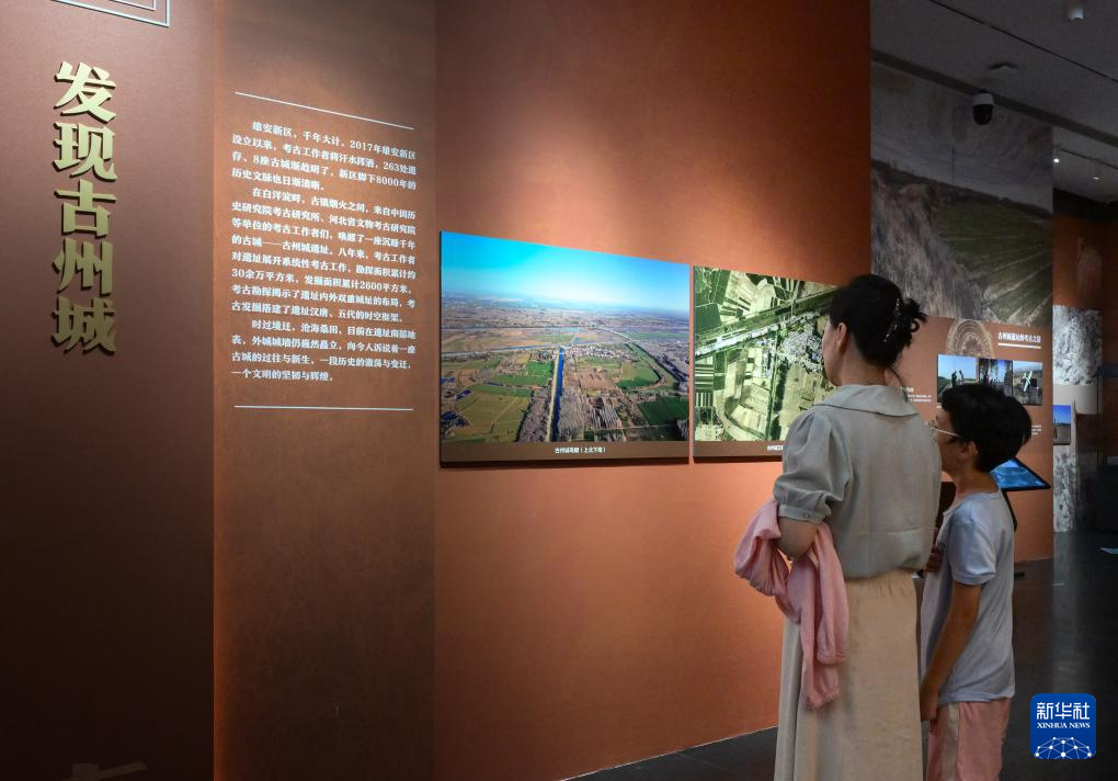 7月28日,观众在欣赏拍摄出土于雄安古州城遗址的唐代龙首。