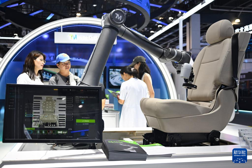 7月26日,观众在用于AI汽车座椅飞拍检测的达明机器人展品前驻足观看。新华社记者 陈浩明 摄