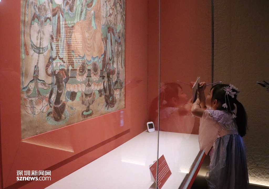 7月29日上午10时许,记者在南山博物馆现场看到,等着验票进场参观的市民在展厅门口有序地排起了队。适逢暑假,不少观众带着孩子前来观展,跟着敦煌专业讲解员在每一个展品和介绍前久久驻足。