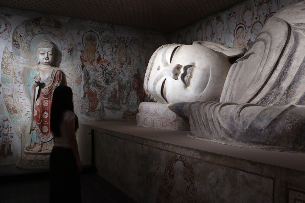 其中,六座精心复原的洞窟最为震撼。它们多为特级保护洞窟,其中第3窟与第285窟属不开放洞窟,莫高窟年代最早的第275窟更是首次实现了数字化整窟输出,第320窟则展出了全壁画临摹作品。此外,以“最美涅槃佛”著称的中唐莫高窟第158窟,以及第17窟“藏经洞”,均在此次展出之列。在敦煌研究院讲解员的生动导览下,观众得以深入佛国圣境,从壁画肌理与彩塑神韵中探寻“石窟中的秘境”,直观领略不同时期敦煌石,窟的艺术神韵。