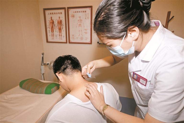 工作人员先找准穴位,再贴上三伏贴。深圳晚报记者 严文婷 摄