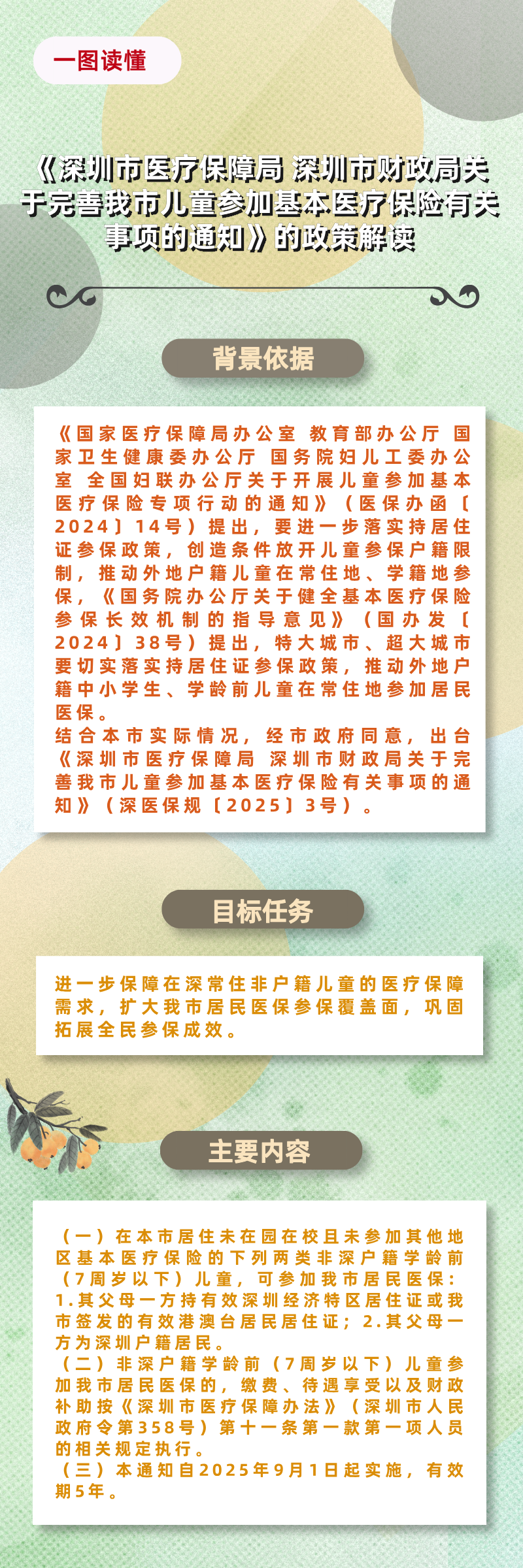 据了解,经市政府同意,深圳市医疗保障局、深圳市财政局联合印发《关于完善我市儿童参加基本医疗保险有关事项的通知》(以下简称《通知》),将符合条件的非深户籍学龄前儿童纳入深圳居民医保范围,自2025年9月1日起实施,预计每年有约10万名儿童受益。