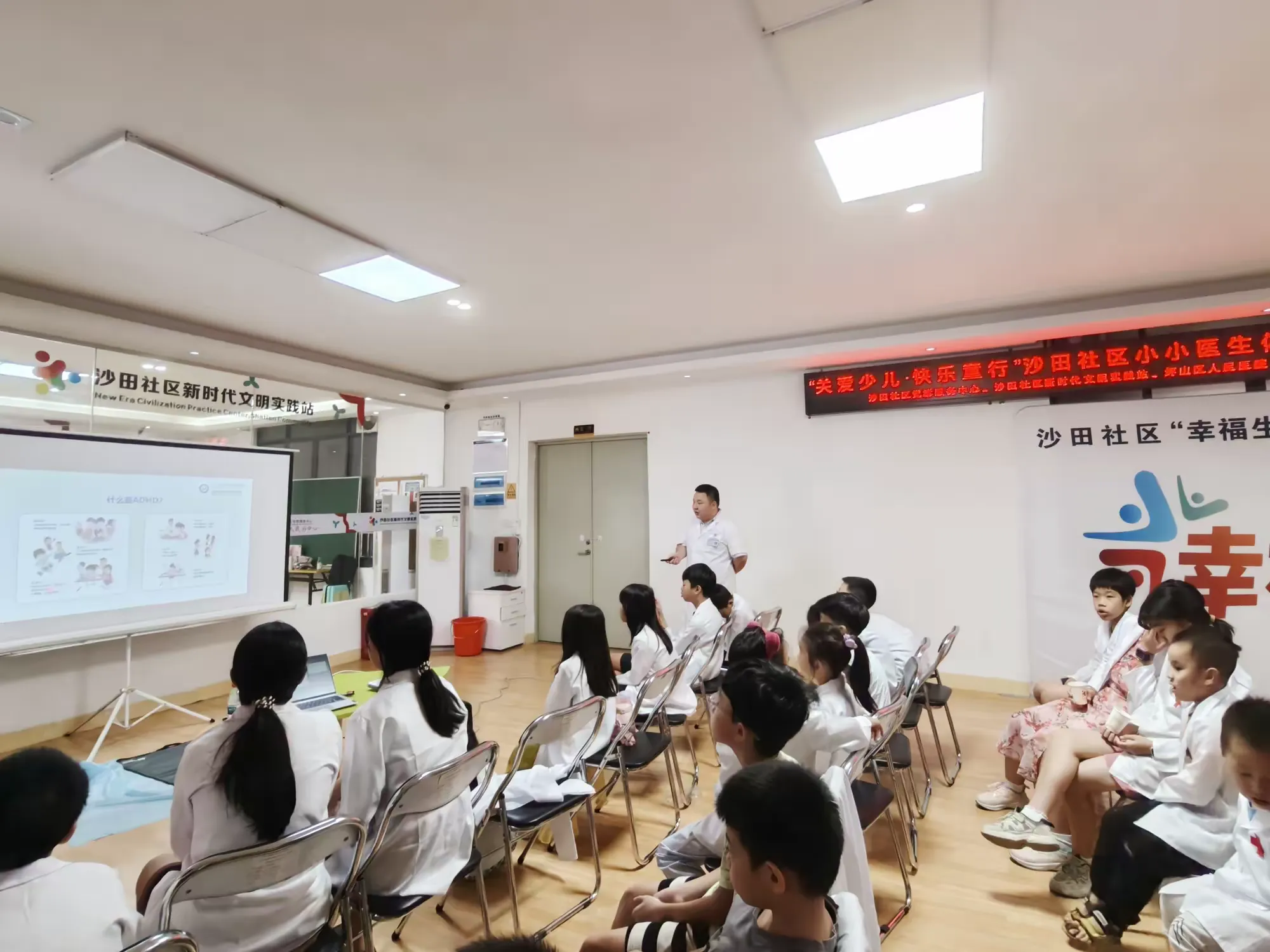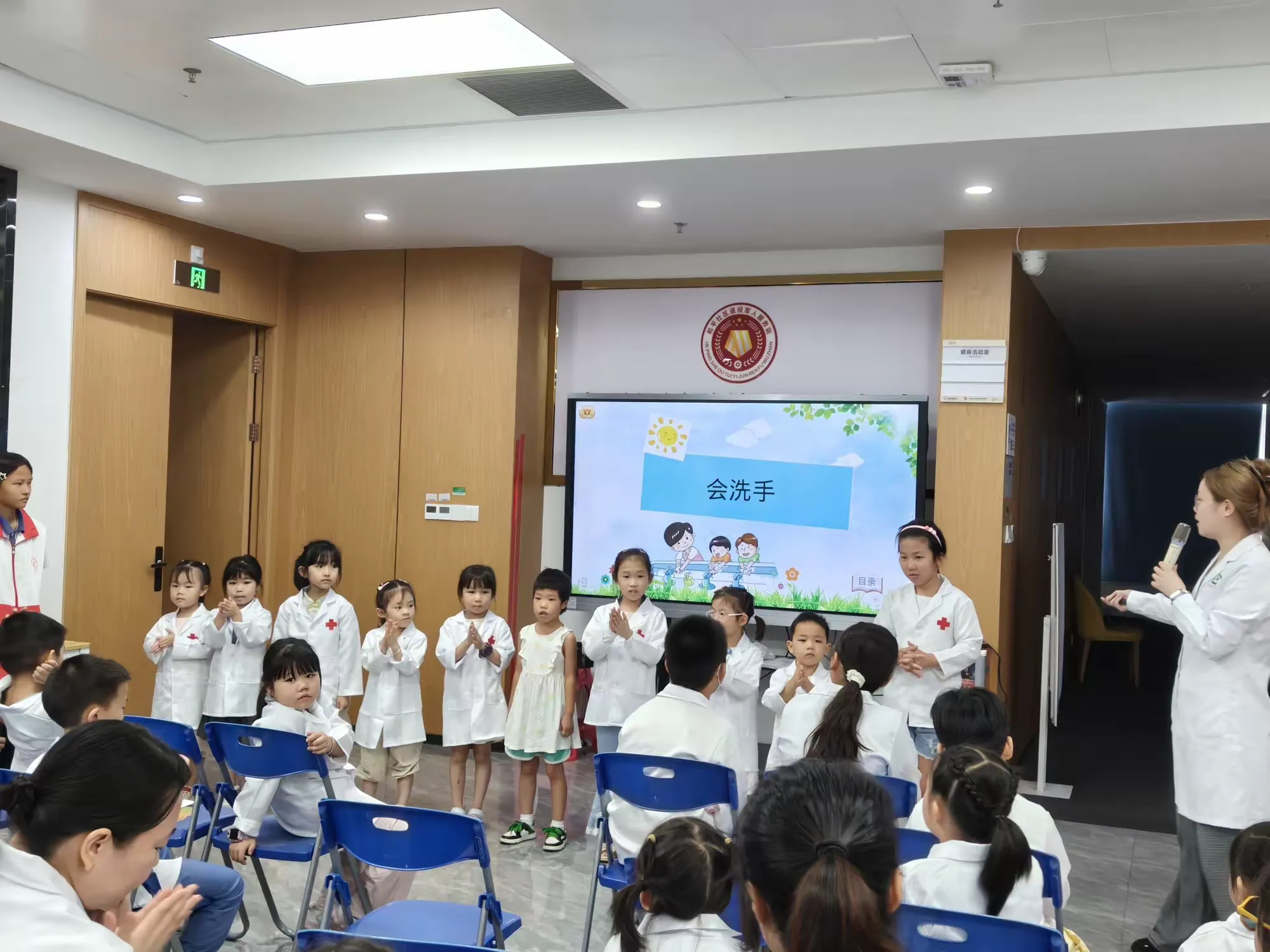 未来白袍体验站:最受欢迎的“小小医生”环节笑声不断!孩子们换上萌萌的“迷你白大褂”,拿起听诊器当“心脏侦探”,在儿童保健科专家的趣味引导下,一本正经地“问诊”,亲身体验医生使命的神圣感。