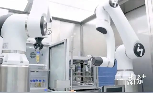 在深圳湾实验室坪山中心与盈合机器人联合成立的实验室内,两台六轴机械臂正在工作,无需科研人员人工干预,工业机器人即可完成一整套复杂的细胞培养工作。“这就是我们的‘细胞工厂’,探索AI制药。”中心主任李子刚说。