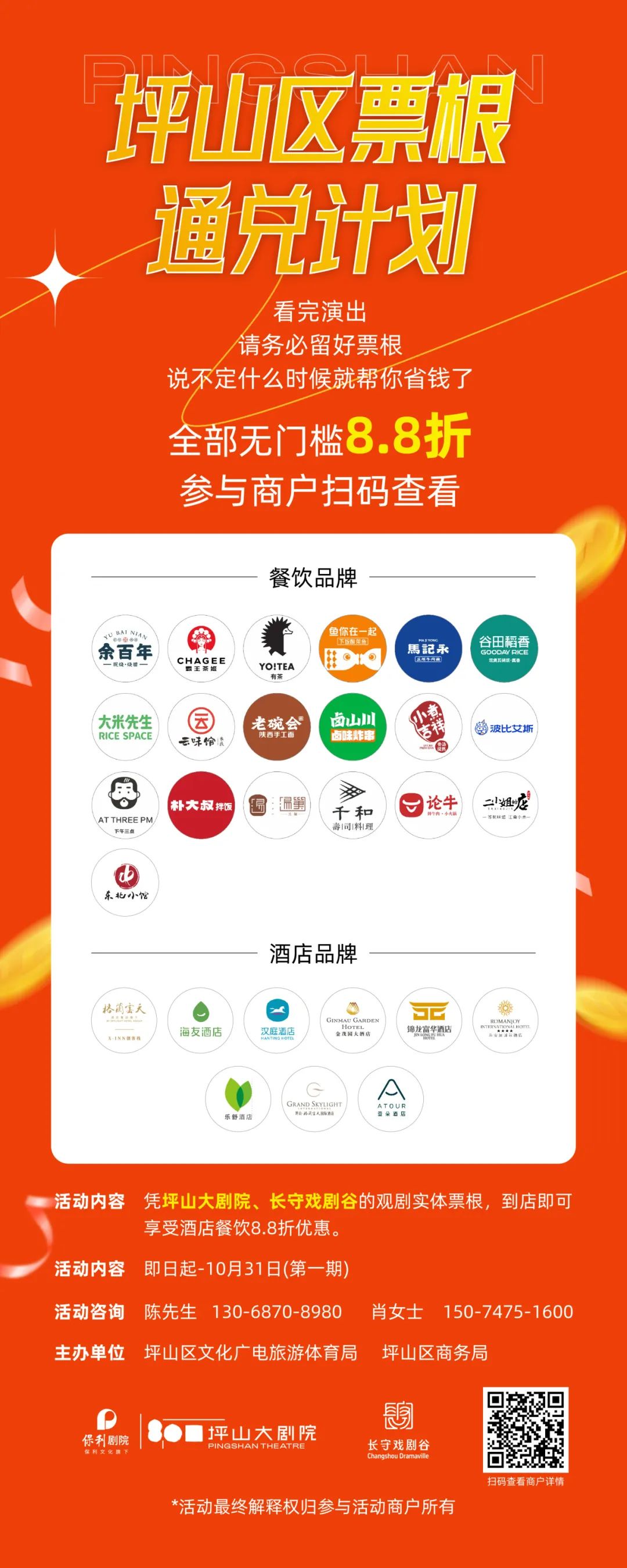 凭坪山大剧院、龙马社小剧场演出票根或青岛啤酒嘉年华现场集章卡(每日限量),在合作酒店、餐饮企业享受专属优惠折扣、兑换特惠套餐或饮品。
