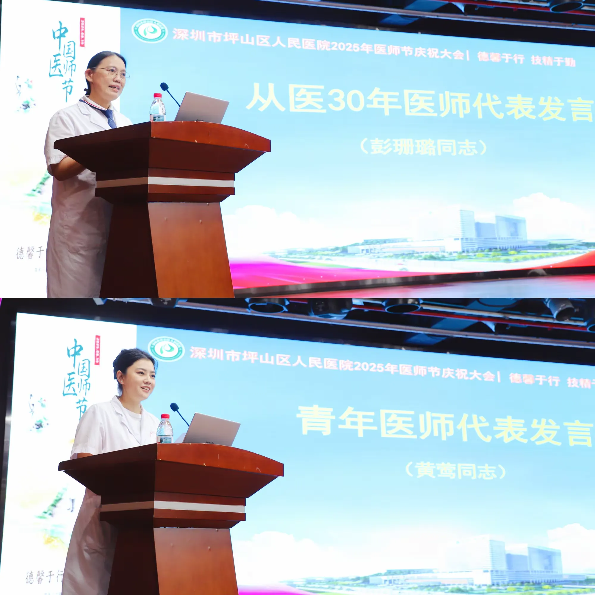 医师代表发言环节充满温情与力量。资深医师代表、拥有30年医龄的彭珊璐医生深情回顾了自己的从医历程,分享了对职业的深刻感悟,表达了对医院培养的感激和对年轻一代的殷切期望。青年医师代表、全国第二届“医者仁心”内分泌疑难病例比赛“全国总冠军”黄莺医生,则结合自身成长和参赛经历,抒发了对医学事业的热爱、对精进医术的追求和对未来发展的憧憬。两代医者的肺腑之言,生动诠释了坪医精神的薪火相传。
