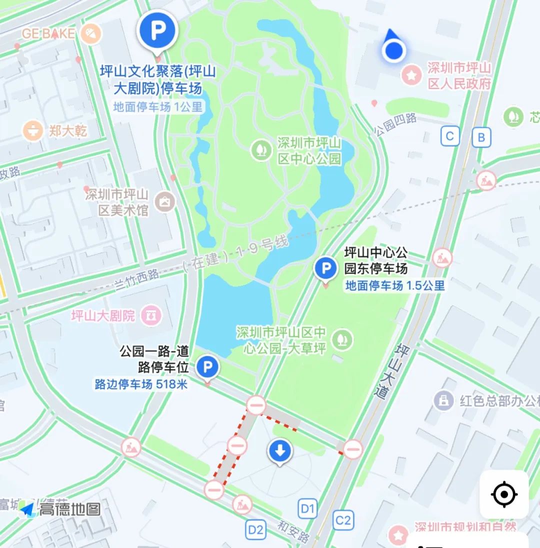导航至坪山中心公园,搜索周边停车场进行停车。
