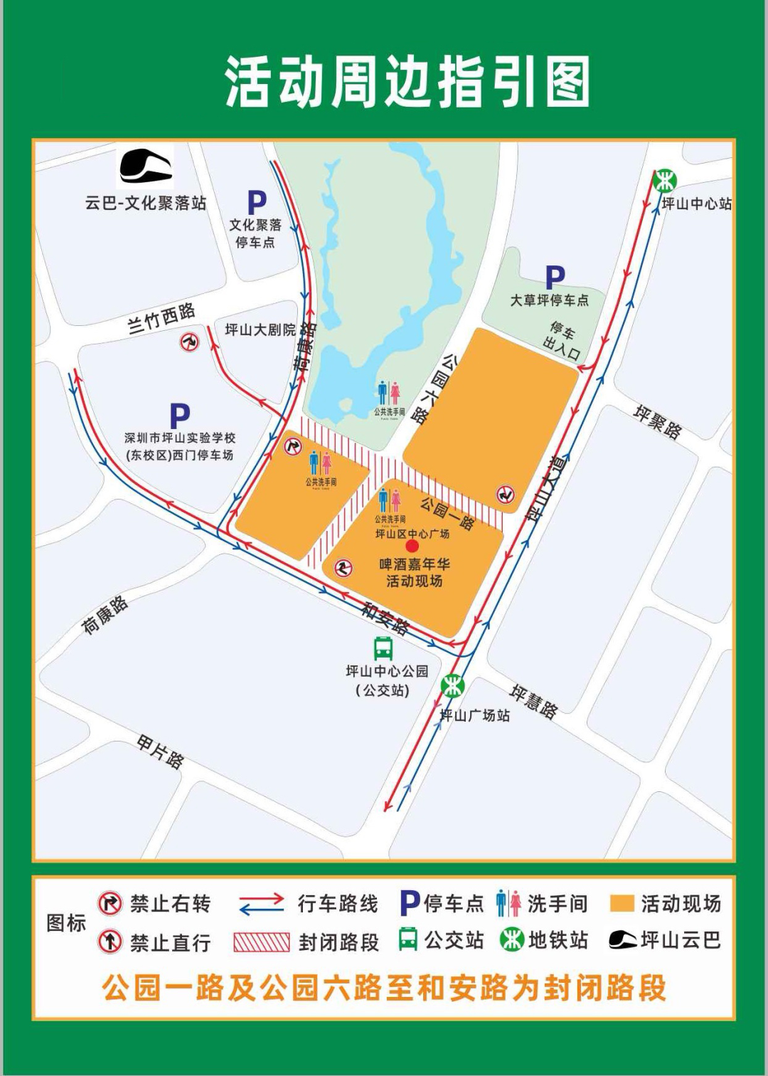 开车不喝酒,喝酒不开车!(电动车驾驶员也要谨记噢~)建议游客优先选择地铁、公交、云巴等绿色出行方式。坪山中心公园周边的住宅区、企事业单位等区域内的人员、车辆,建议错峰出行,避开啤酒嘉年华交通高峰期。其他路段需要临时交通管制时,以交通标志和现场交通警察指挥为准。啤酒嘉年华期间,请广大驾驶员朋友严格遵守交通规则,听从指挥,不乱停车、不乱调头、文明礼让行人。