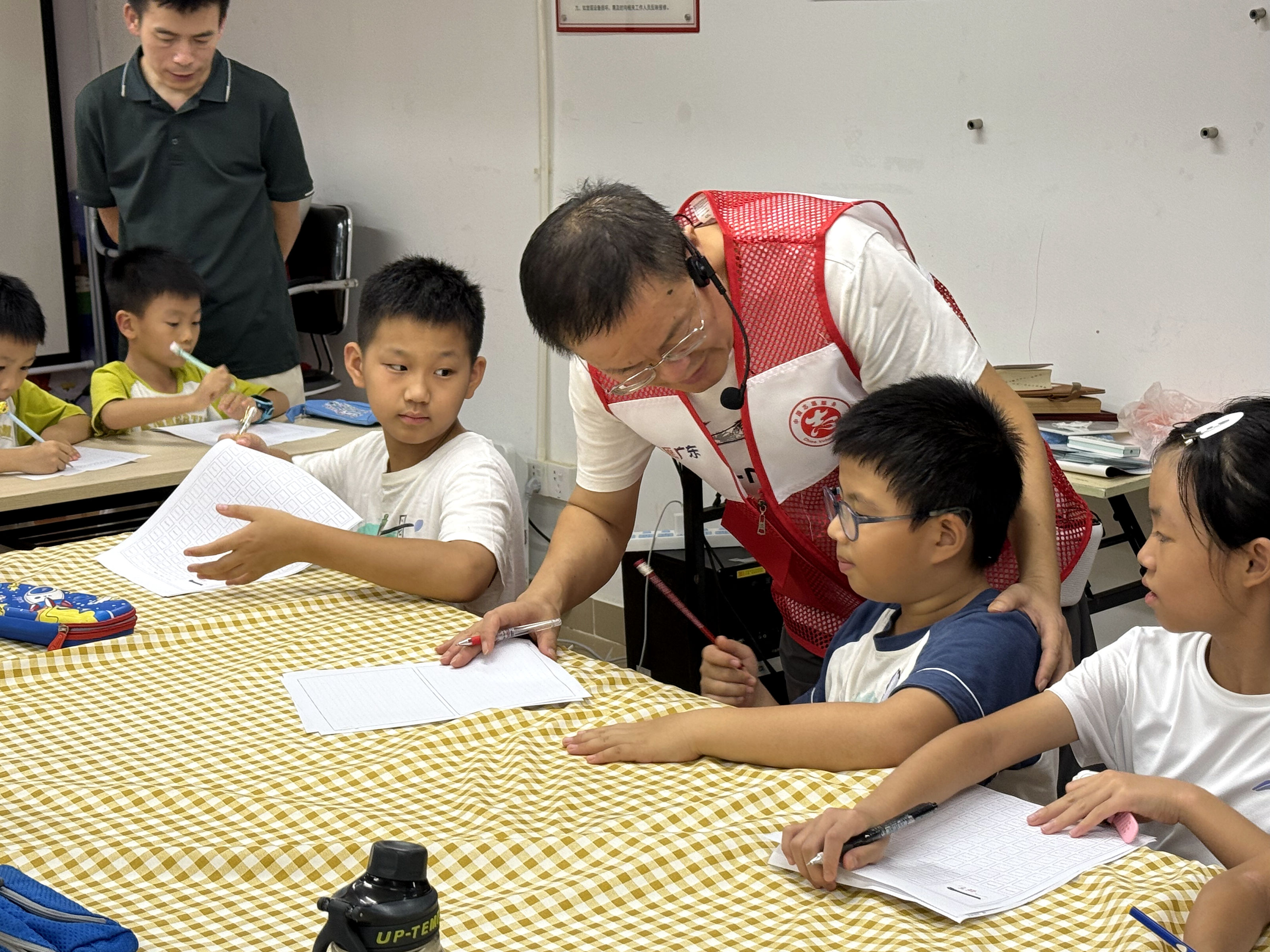 活动特邀社区能人李叔叔担任授课讲师,共有五节课程,根据年龄分为幼儿班(5-6岁)和少年班(7-10岁)。幼儿班注重基础养成,讲师通过生动语言和口诀“身坐正,脚放平,胸离桌子一拳远”,帮助孩子掌握正确坐姿与握笔姿势,并从横、竖、撇、捺等基本笔画入手,耐心指导起笔、行笔、收笔等步骤,培养孩子专注力与书写兴趣。少年班则侧重规范提升,针对笔顺颠倒、笔画不规范等问题帮助孩子们进行改正,并指导笔画衔接与粗细变化,提升他们书写的工整性与美观度。孩子们认真听讲,积极练习,遇到问题及时向讲师请教,学习氛围十分浓厚。