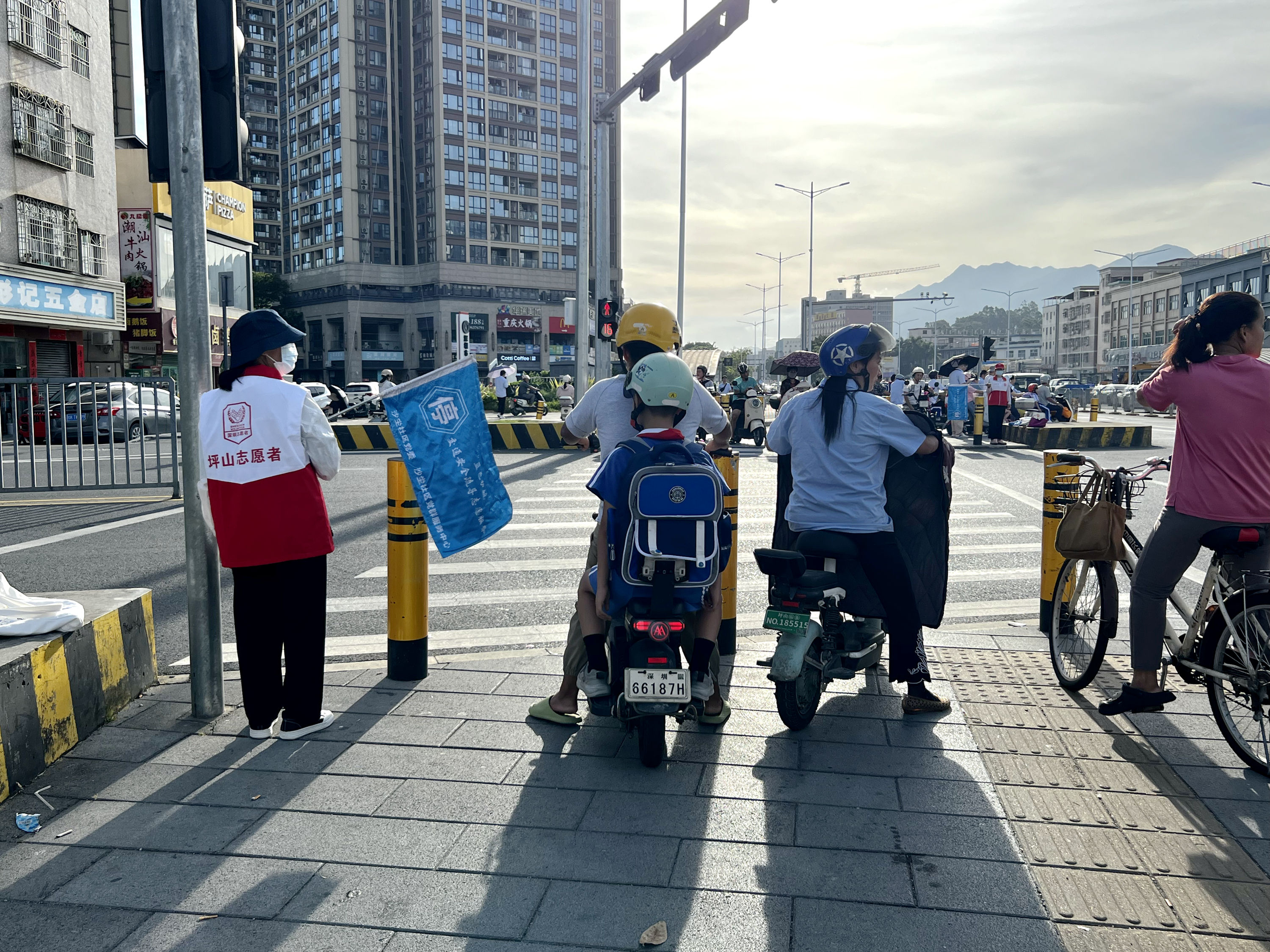 9月1日上午,度过了暑假时光的学子们纷纷启程回到校园。在清晨的阳光下,马峦街道辖区内各中小学、幼儿园上学路上熙熙攘攘。穿着红马甲的志愿者们也早早行动,在学生们密集返校的时间开展护航行动。