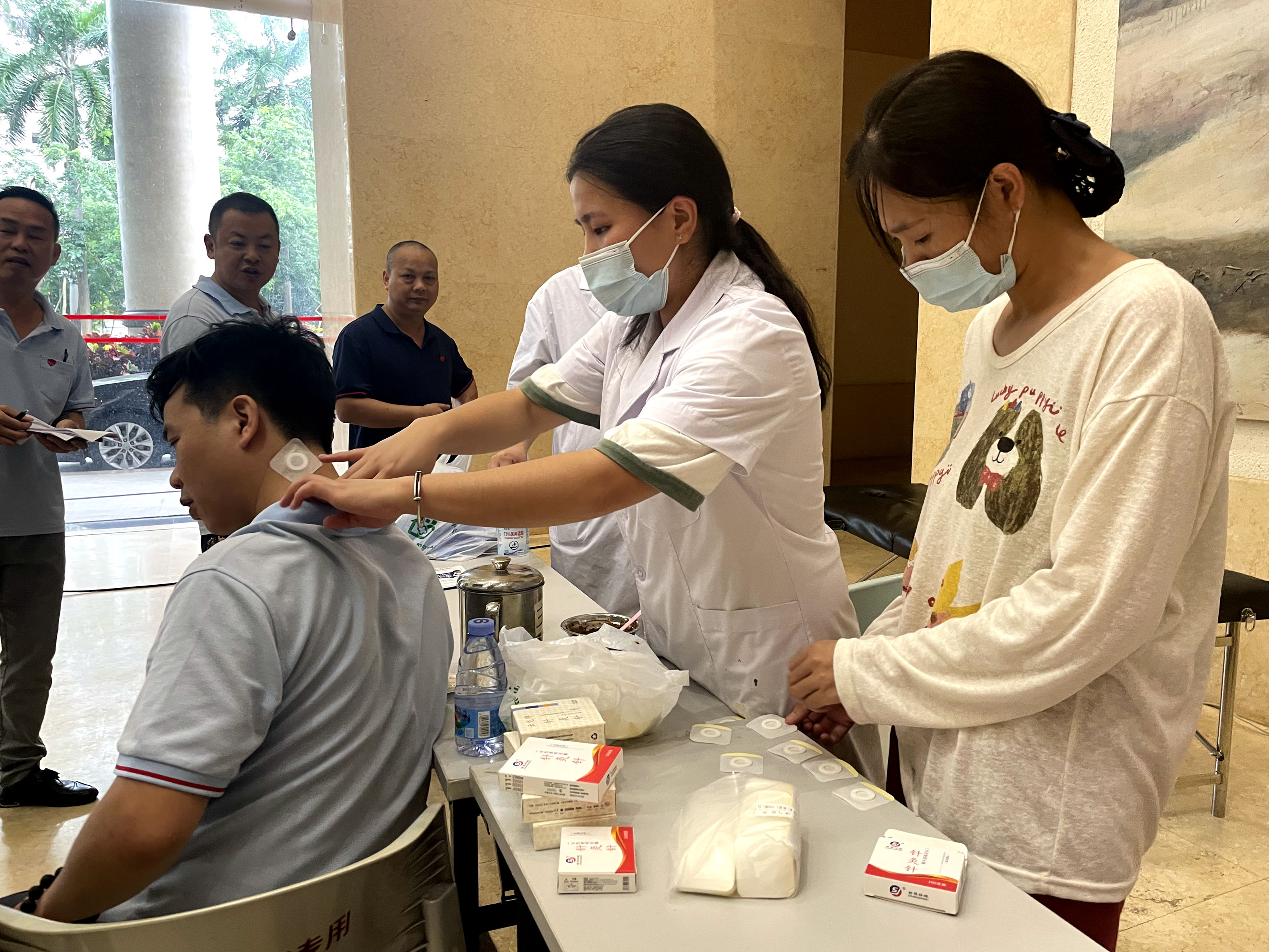 在协力工业园,沙坣社区党群服务中心联合社区工联会与牛角龙社区健康服务中心,把中医理疗活动送到职工身边。