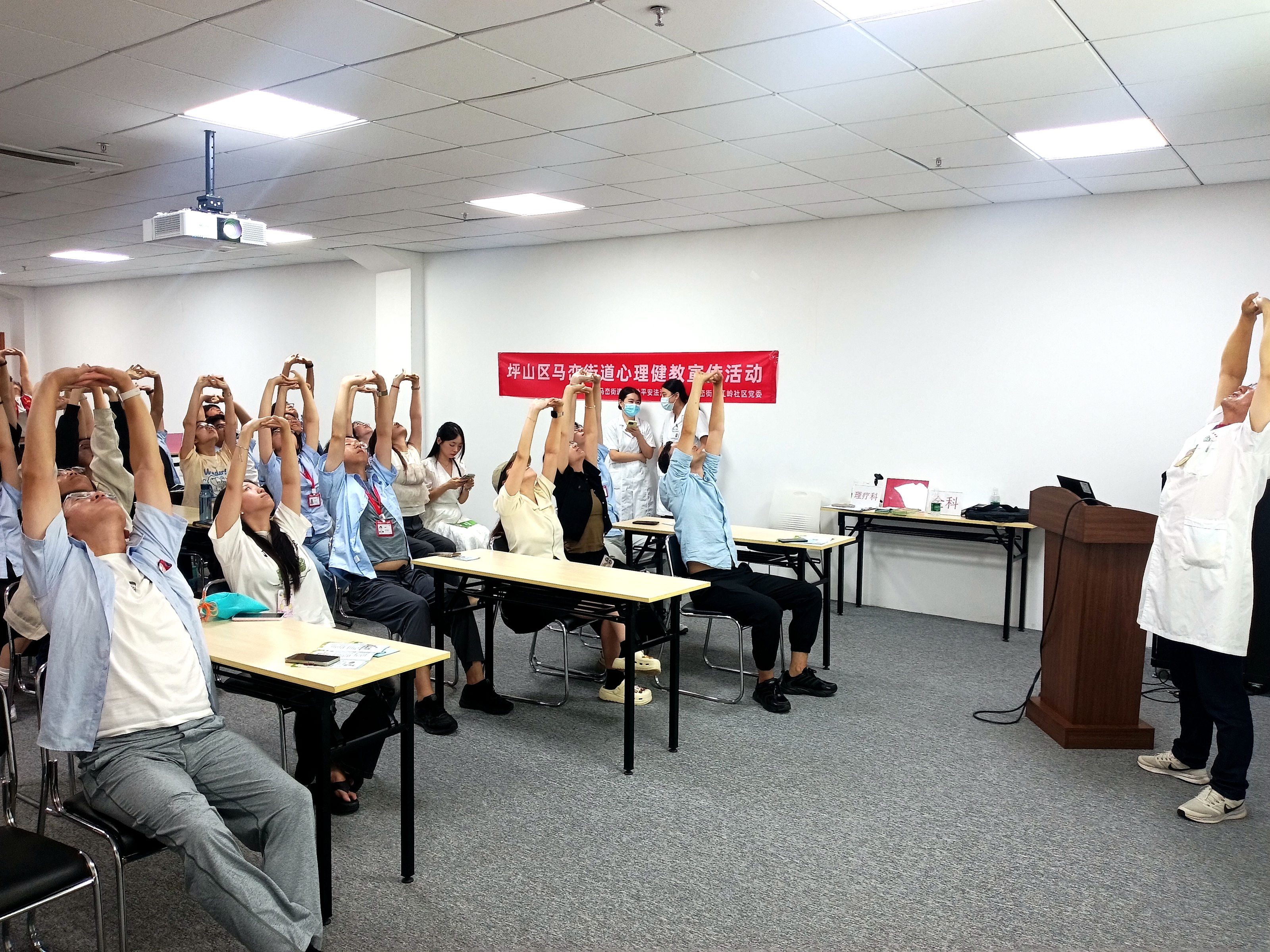 来自香江社康全科的刘医生结合办公族常见问题,用图文并茂的方式为职工们讲解了颈椎病的成因、症状及预防要点,重点示范了“颈部米字操”“坐姿调整法”等实用护颈技巧。“长期低头看手机、伏案工作易导致颈椎曲度变直,每小时起身活动5分钟能有效预防。”刘医生的讲解让职工们频频点头。理疗师化身“贴身教练”,以办公室座椅为教具,现场演示穴位定位技巧,正确的推拿力度与手法。并带领大家练习“举手抬头”“抱头压颈”“扩胸拉伸”等颈椎拉伸操,现场职工纷纷起身跟随练习。“平时工作总对着电脑,肩颈僵硬得像块铁板,现在学会这些方法,随时能给自己‘松松绑’!”一名比亚迪工程师边练习边兴奋地分享。活动现场还设置了心理健康宣传台,党群社工耐心询问职工压力情绪状态,邀请职工填写压力自测表,分享日常心理调适的方法,引导职工树立积极乐观的心态,提升心理调适能力。