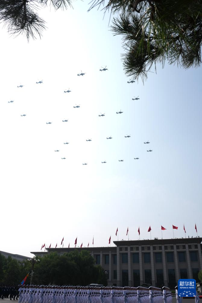 9月3日,纪念中国人民抗日战争暨世界反法西斯战争胜利80周年大会在北京隆重举行。这是空中护旗梯队。