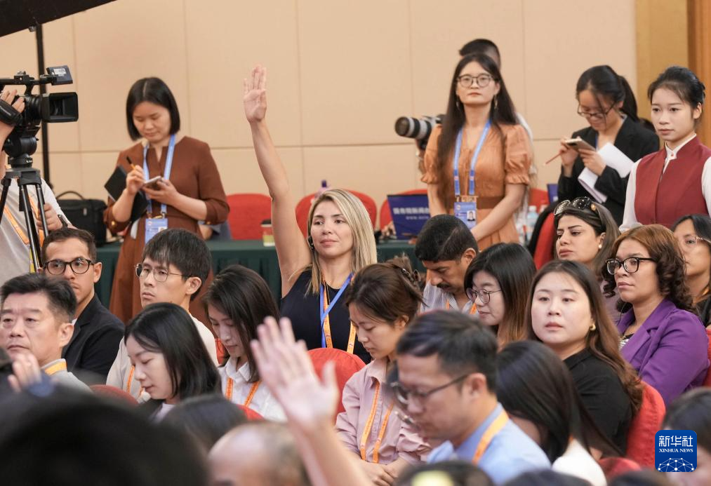 9月1日下午,中国人民抗日战争暨世界反法西斯战争胜利80周年纪念活动新闻中心举办第二场记者见面会,缅甸中华总商会会长林文猛、马来西亚吉隆坡广东义山主席杨博耀、斐济华人文化艺术经济联合会荣誉会长方志伟、西班牙中国和平统一促进会会长徐松华、澳大利亚悉尼华星艺术团团长余俊武等华侨华人代表介绍华侨华人在世界各地举行的纪念活动及其对抗战的贡献等方面情况,并回答记者提问。这是记者举手提问。
