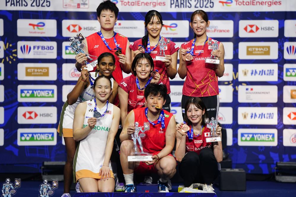 8月31日,冠军中国选手石宇奇(左二)、亚军泰国选手昆拉武特(左一)和季军丹麦选手安东森(右二)、加拿大选手赖浩俊在颁奖仪式上。新华社记者 彭子洋 摄
