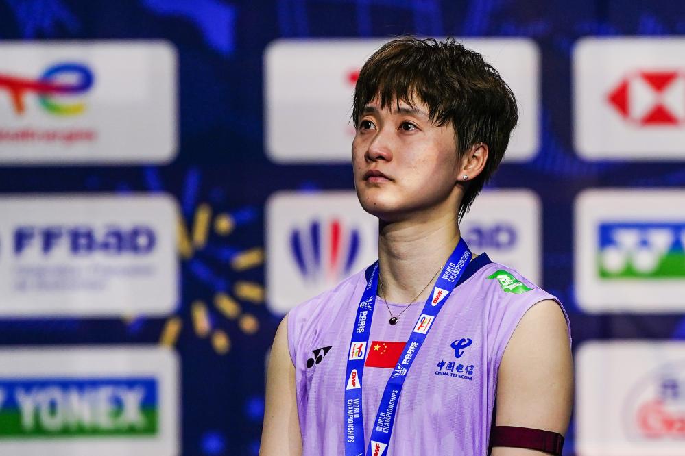 8月31日,亚军中国选手陈雨菲在颁奖仪式上眼含泪水。新华社记者 彭子洋 摄