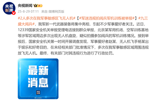近日,12339国家安全机关举报受理电话接到群众举报,北京某军用机场、空军训练基地等涉军区域周边多次出现无人机盘旋,疑似拍摄参加阅兵的军机训练情况。接到举报后,国家安全机关第一时间开展调查发现,军事爱好者赵某、无人机飞手杨某出于娱乐和好奇目的,在未经相关部门批准情况下,多次在我军事敏感区域周围违规放飞无人机。最终,有关部门对其违规行为进行了行政处罚。