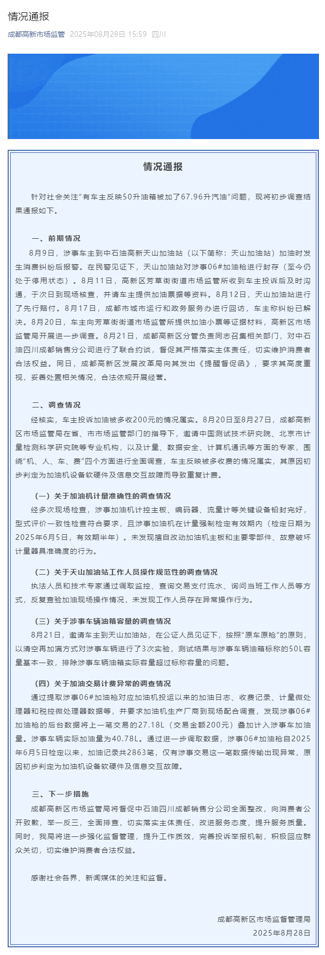 成都高新区市场监督管理局通报,针对社会关注“有车主反映50升油箱被加了67.96升汽油”问题,现将初步调查结果通报如下。