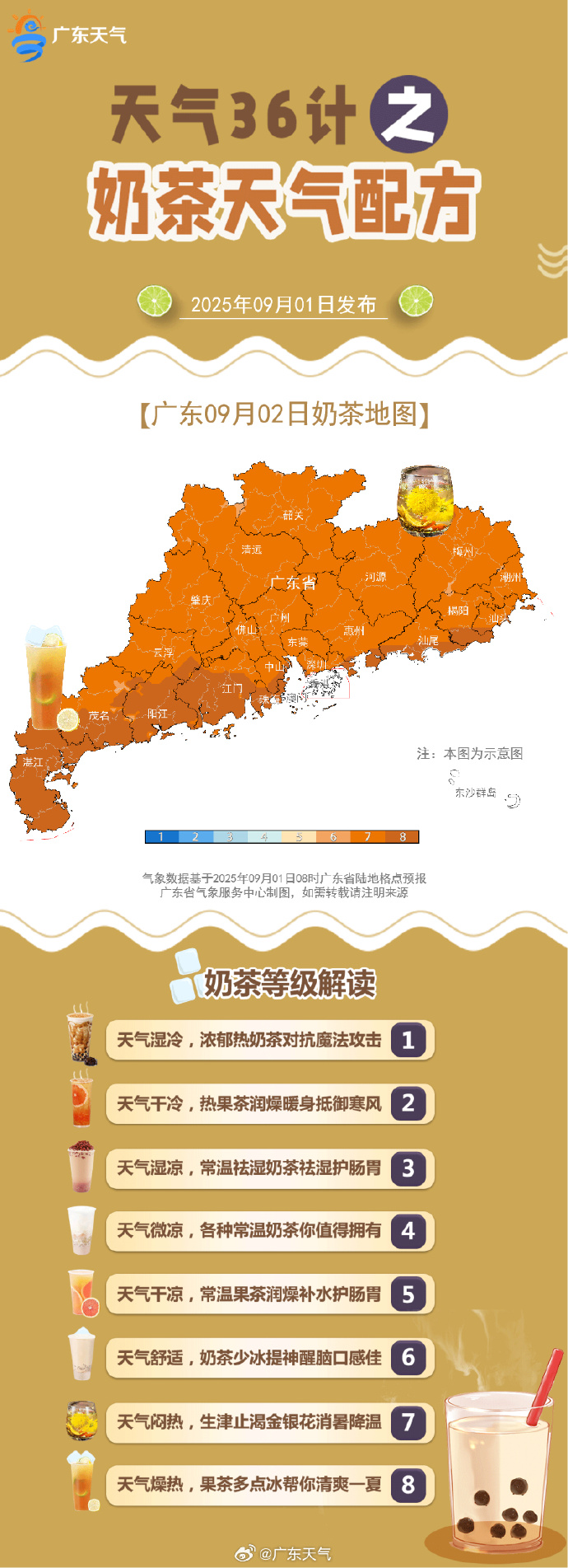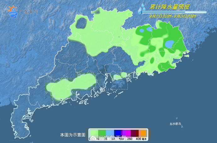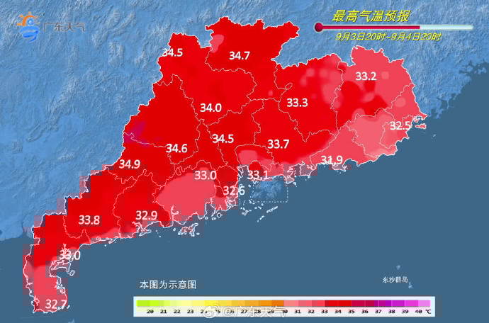 预计,未来三天,广东省受副热带高压控制,全省大部有35℃以上的高温天气。9月2日,全省大部多云到晴天,有分散雷阵雨,局部有暴雨;9月3-4日,广东省中东部市县转中到强雷雨局部暴雨,雷雨时伴有8~10级短时大风,其余市县晴到多云,有分散雷阵雨。天气炎热,注意防暑防晒。