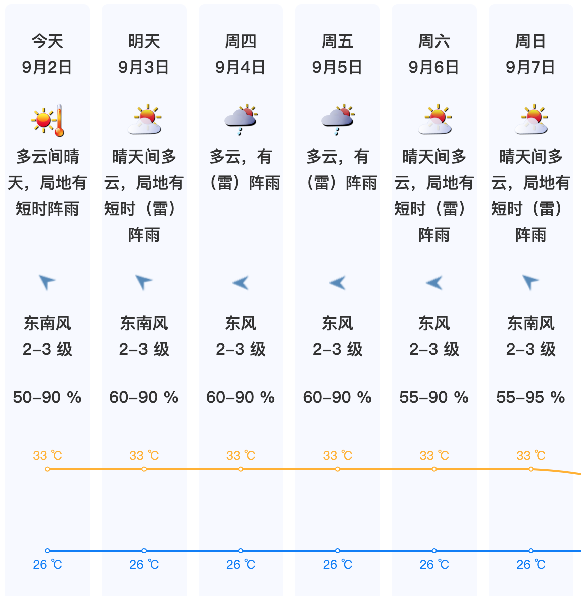 9月2-3日深圳市持续晴热,偶有短时(雷)阵雨,气温26-33℃,中北部及人口密集区可达35℃;