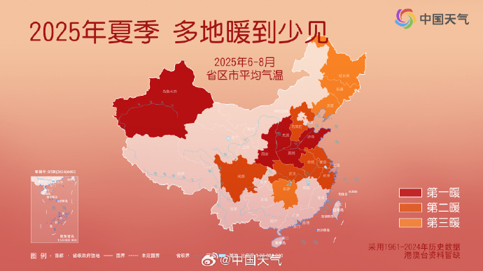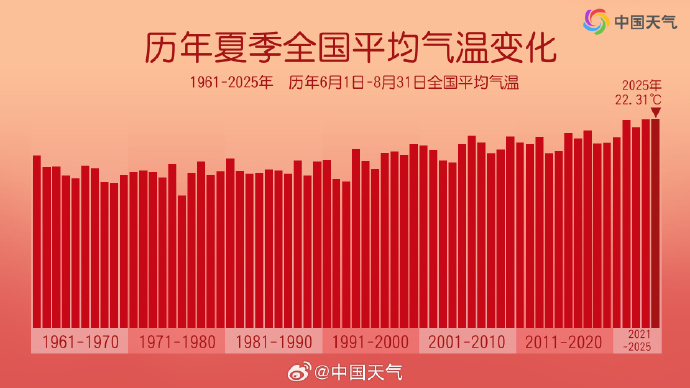 据@中国天气,刚刚过去的夏季(6月至8月),我国平均气温创历史新高,成为观测史上最热夏季。国家气候中心公布数据显示,今年6至8月,我国大部热力十足,全国平均气温达22.31℃,其中新疆、陕西、河南、山西、山东平均气温为同期第一高,江苏、浙江、河北、上海、四川、湖北、安徽为第二高,湖南、吉林、辽宁、黑龙江第三高。