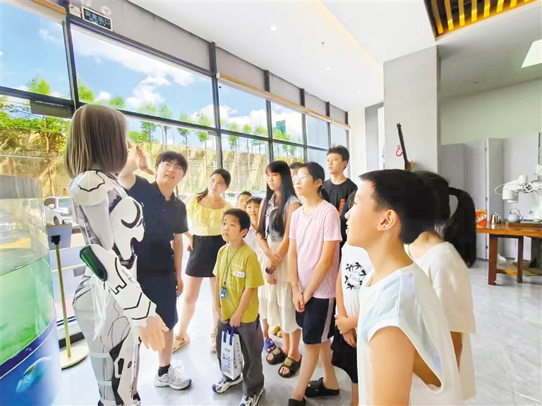 活动伊始,工作人员带领青少年来到展示区,当看到仿生鱼摆动着灵活的“鱼鳍”在水中自在游弋时,孩子们立刻围拢过来,认真观察仿生鱼游动的姿态。