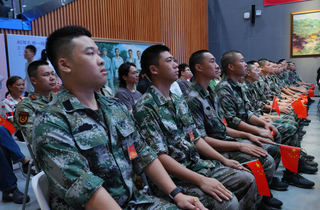 在东江纵队纪念馆,东纵研究会和老战士后代,深圳技术大学师生代表,东纵小学学生观看纪念大会。