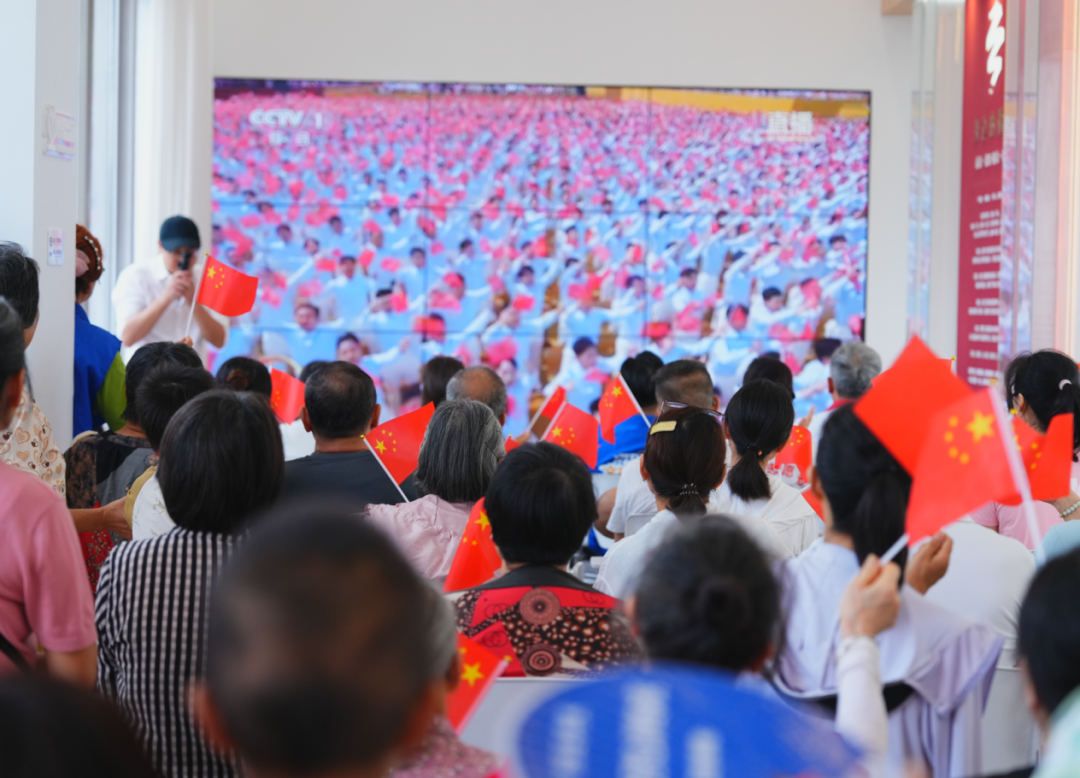 龙华区新时代文明实践中心聚集了众多志愿者和社区居民,一同观看大会直播。他们手中挥舞着国旗,全神贯注地紧盯屏幕,生怕错过任何方阵和新装备的亮相。当仪式在《歌唱祖国》的旋律中步入尾声,大家不约而同地挥动国旗,齐声合唱,用最真挚的歌声表达对祖国深沉的热爱。