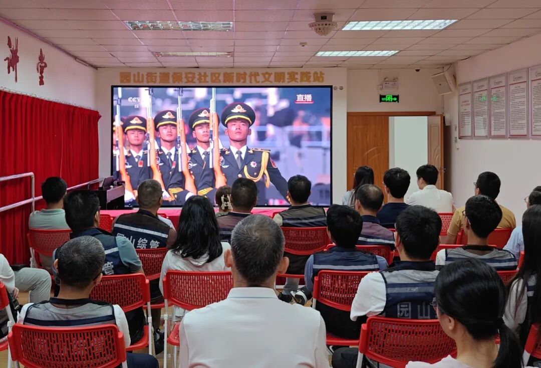 光明区新时代文明实践中心(所、站)积极组织集中观看活动,辖区居民、党员和社区工作者通过大屏幕共同观看了这场盛大阅兵。在观看现场,官兵们整齐划一的步伐、昂扬抖擞的精神以及首次公开亮相的新型装备,引发了阵阵赞叹声,大家深切感受到了国家日益强大的国防与科技实力,经历了一次深刻的爱国主义教育和精神洗礼。
