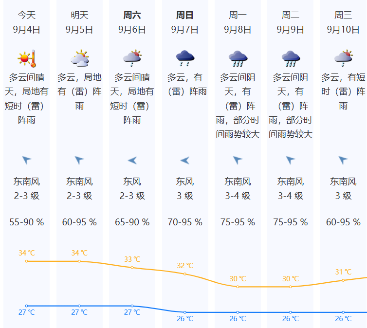 预计5-6日炎热天气持续,中午前后易出现雷阵雨,雨时可能伴有短时大风;7-9日多(雷)阵雨,部分时间雨势较大。