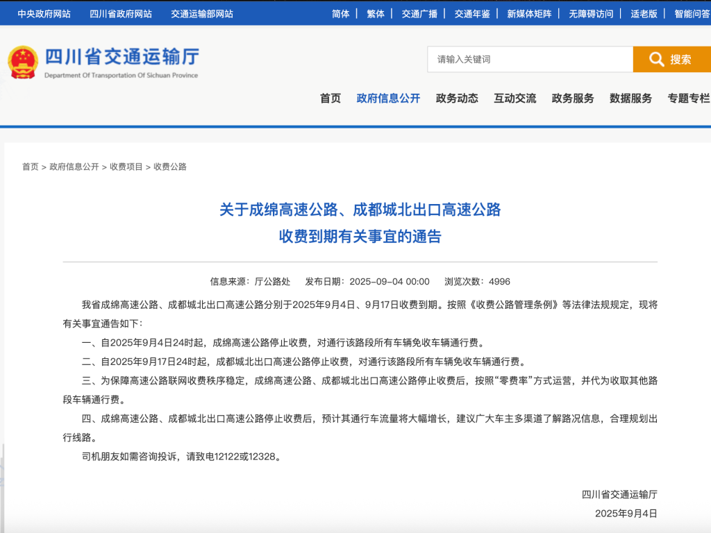 9月4日,四川省交通运输厅发布通告称,成绵高速公路、成都城北出口高速公路收费到期,即将停止收费。其中成绵高速于9月4日24时起,停止收费。