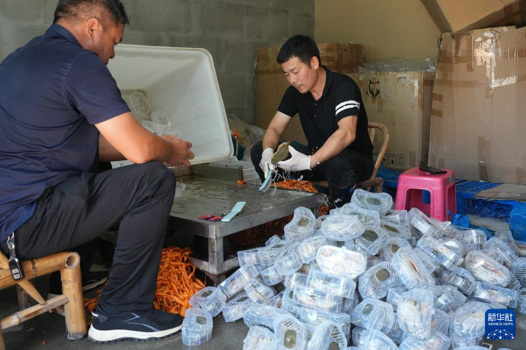 9月2日,在宁海县一市镇的一家青蟹生产企业,工作人员用免绳缚的专利包装“安居房”打包青蟹。