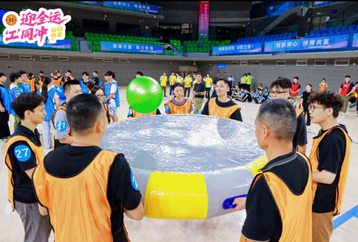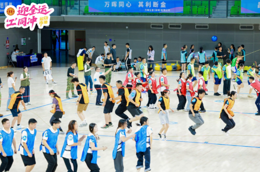 场馆内,“一群人的努力”团队挑战赛火力全开,31支代表队轮番上阵。跳大绳区域长绳飞旋,10人同步跃起再落地;袋鼠运球区域彩色布袋接连蹦跳,折返点精准传球;雷霆战鼓区域10面团鼓齐下,鼓点与灯控矩阵同频。现场鼓声、呐喊声层层叠加,积分排行榜不断刷新。最终区教育工联会、万晖五金(深圳)有限公司、深圳市亿道控股有限公司代表队分获冠亚季军,为团体挑战赛画上圆满句号。