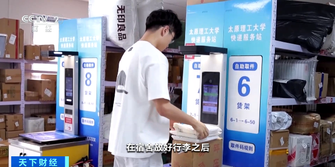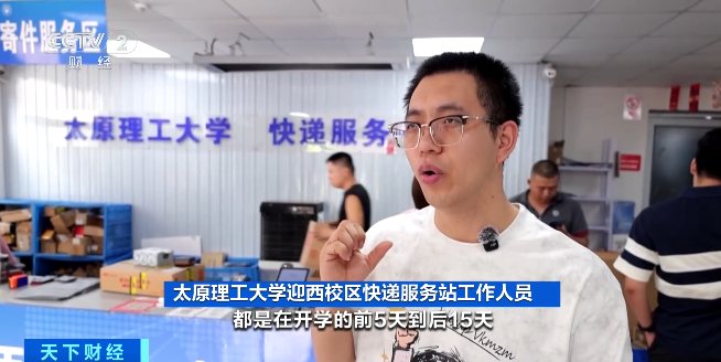 在太原理工大学迎西校区,这里的快递服务站格外忙碌,货架满满当当,快递员忙着扫码、分类、上架、通知取件。不少学生到校的第一件事,就是来快递服务站“收货”。