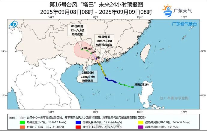 受台风影响,预计8-9日白天广东陆地将有一次严重风雨过程。