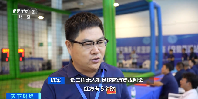 长三角无人机足球邀请赛裁判长 陈梁:红方有5个球,蓝方有5个球,然后每个球都由一名操纵手来操控,其中(双方各)有一个是得分球,只有这个得分球进了对方球门才算得分。