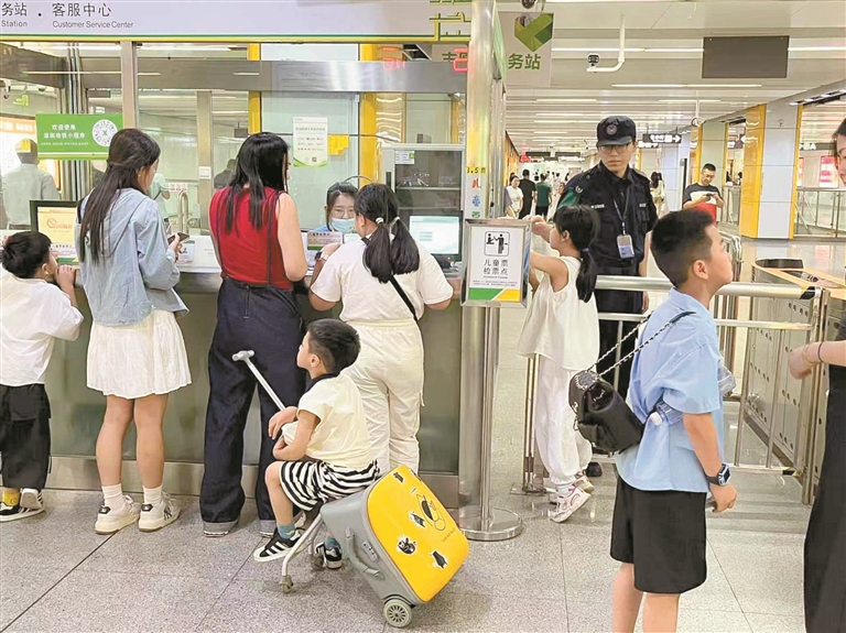 ▲家长在地铁服务台前为孩子购票。 本组图片由深圳晚报记者 李超 实习生 陈劲濠 摄