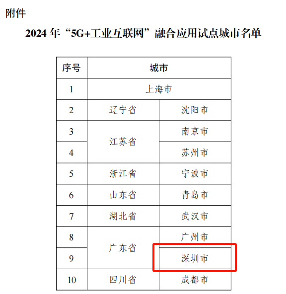 2024年11月,深圳入选全国首批“5G+工业互联网”融合应用试点城市名单。融合应用试点城市是推动“5G+工业互联网”高质量发展,赋能产业数字化转型升级的前沿阵地,深圳的入选有助于深圳发挥5G产业的先发优势,引领产业智能化、绿色化、融合化发展。