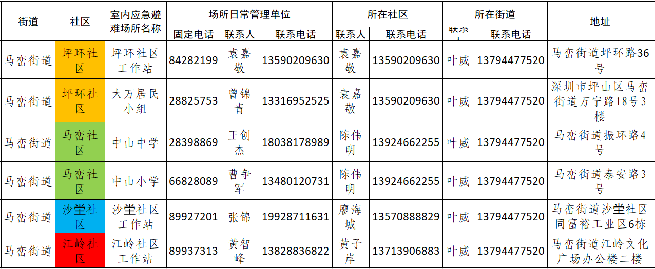 目前, 马峦街道6处应急避险场所已做好开放准备,可容纳人数760人。同时,街道积极联系坪山区应急局、区教育局开放具备避险功能的树人实验学校、第二外国语学校在紧急时刻作为临时应急避难场所开展人员安置,共可容纳900人。