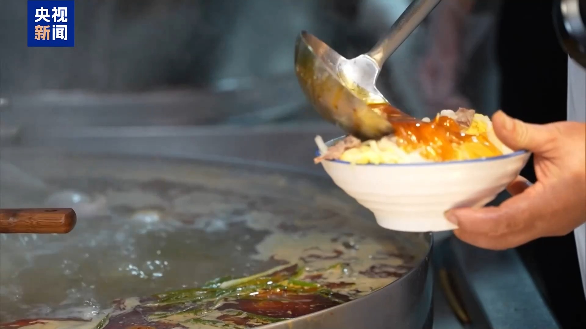 同样不能错过的还有安徽的“早餐顶流”——淮南牛肉汤。清晨的街头,大锅翻滚着奶白色的汤底,牛骨与数十种香料熬出醇厚滋味,再加入粉丝、千张、豆饼,撒上香菜和胡椒粉。喝一口,鲜香扑面而来。