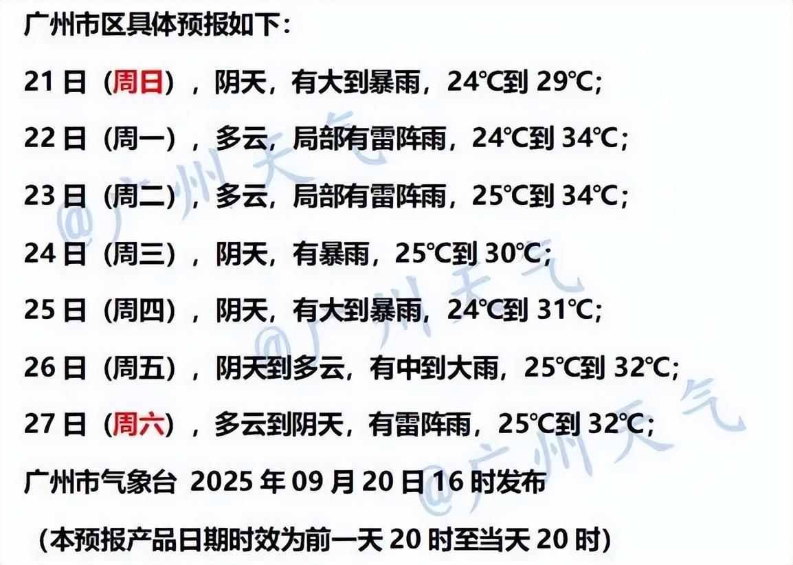 广州市气象台预计,9月21日广州继续受“米娜”残余环流影响,有大到暴雨局部大暴雨。因“米娜”而来的凉快很快要下线,9月22日—23日广州转以多云偶有雷雨为主,最高气温回升。9月24日—25日受台风“桦加沙”影响,广州又有一次强风雨过程。