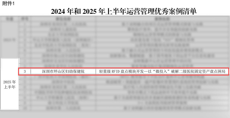 深圳新闻网2025年9月28日讯(记者 邱嘉熙 通讯员 张祎冉 詹汉锋)近日,深圳市坪山区妇幼保健院凭借自主开发的轻量级RFID盘点模块,获评深圳市“公立医疗机构经济管理年”运营管理优秀案例。该自主研发盘点模块以低投入解决了医院固定资产盘点效率低、账实不符等管理难题,相关成效数据凸显医院卓越的运营管理创新能力,为同类医院提供可复制的低成本数字化管理方案。