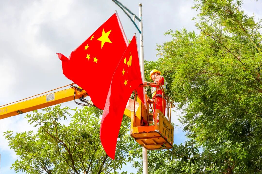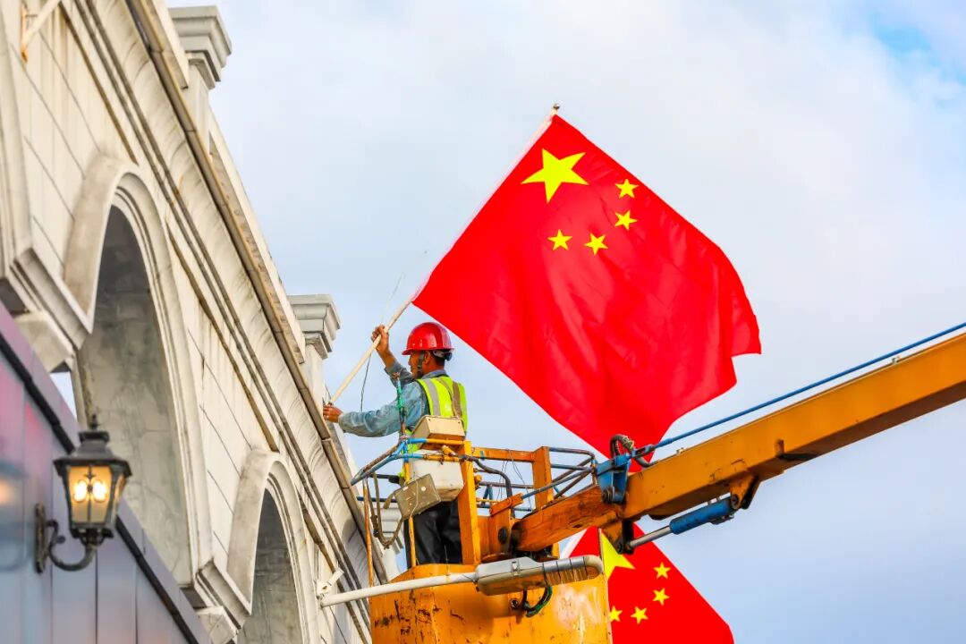 工人们细致作业,将一面面鲜艳的国旗逐一固定在路灯杆上,力求排布规整、安装牢固兼具美观与庄重。