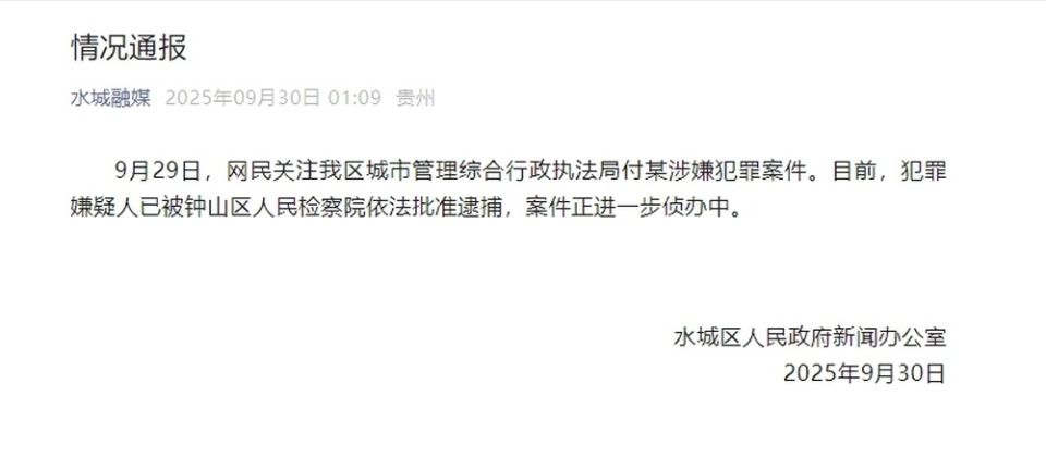 30日,贵州省六盘水市水城区人民政府新闻办公室针对“城管局副局长被指长期性侵继女”一事发布情况通报,全文如下:
