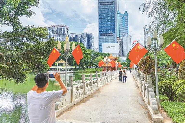 节日将至,各大公园已装扮一新、喜气洋洋。莲花山公园、深圳湾公园、中心公园等各大公园开启节日模式,一抹抹鲜艳的五星红旗迎风飘扬,“生态绿”与“中国红”相互衬托,点燃了节日热烈喜庆的氛围。
